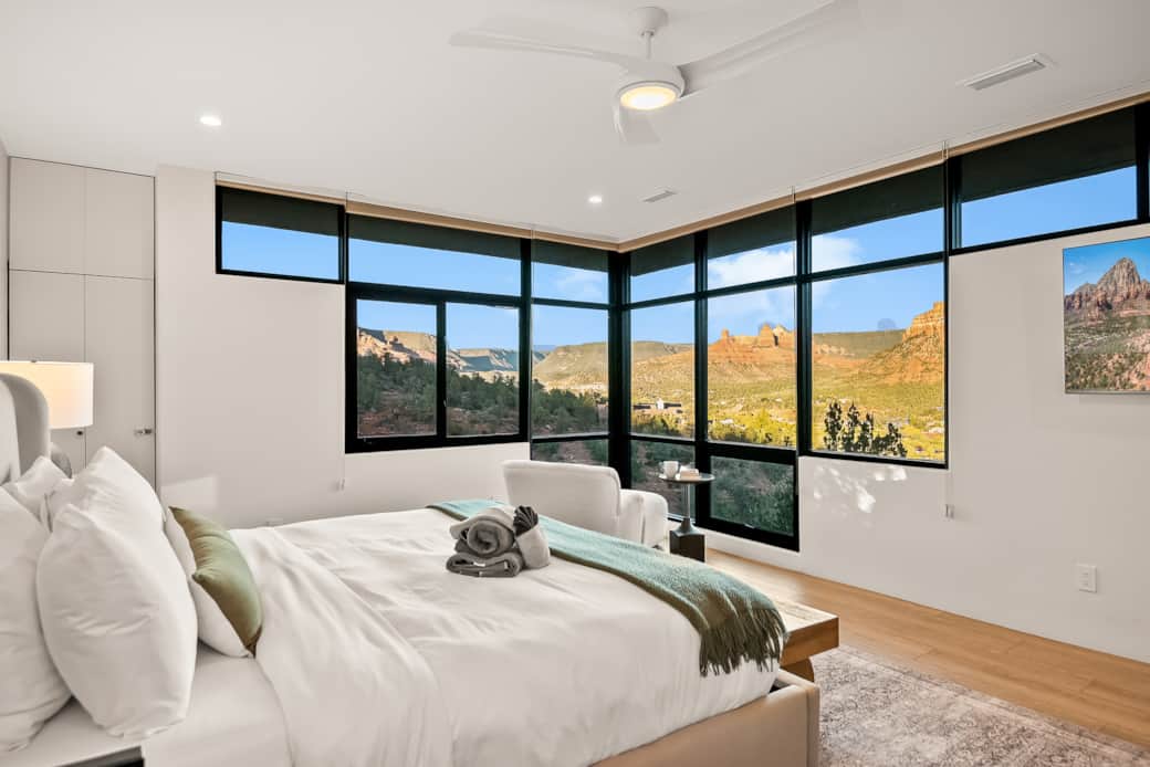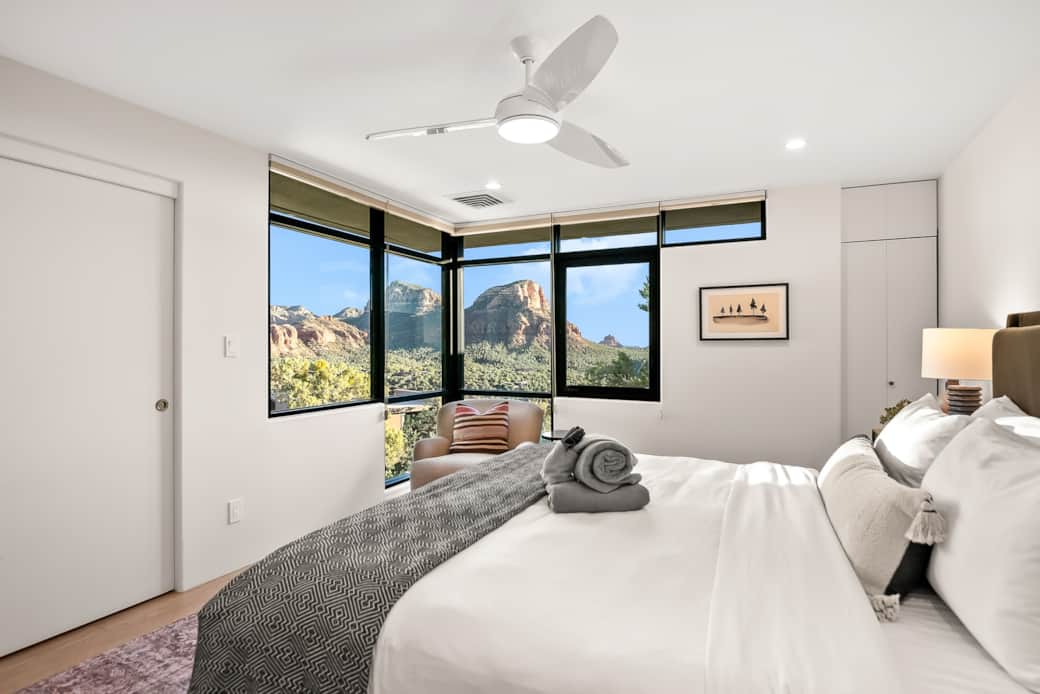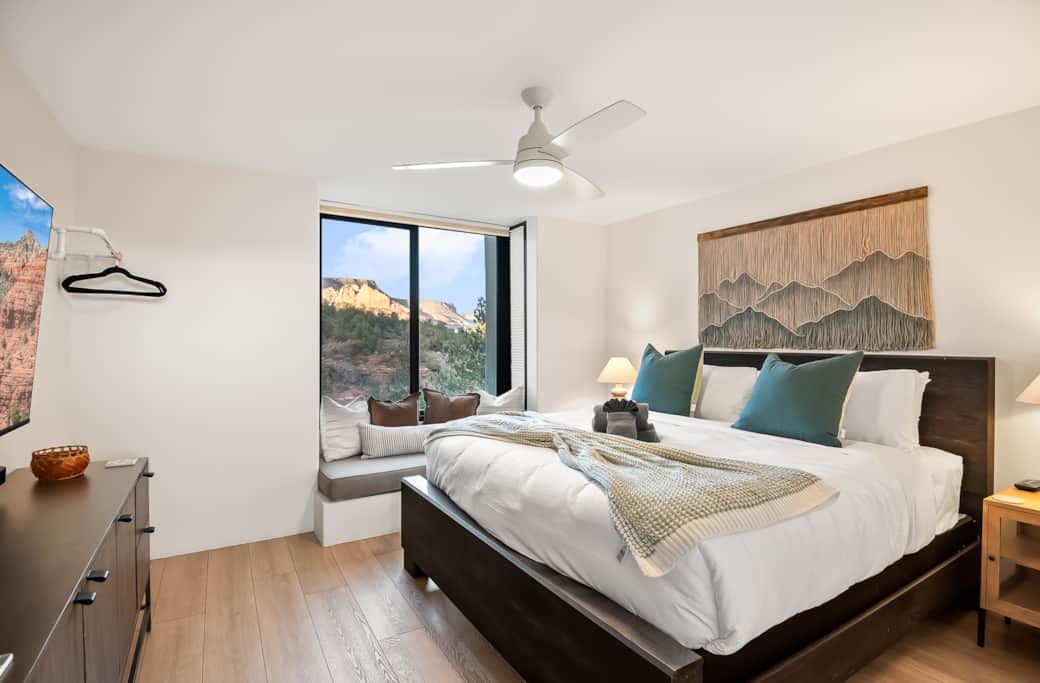 King Bed with unique decor and red rock views. Shared bathroom with 4th bedroom.